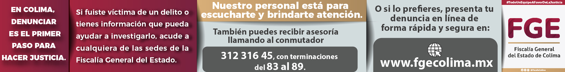 Las instituciones que integran la Mesa de Coordinación Estatal reiteran su compromiso de seguir trabajando por la tranquilidad de las familias colimenses, y combatiendo la criminalidad y la impunidad; asimismo, hacen un llamado a la ciudadanía a que denuncie cualquier delito del que tengan conocimiento o cualquier hecho que pueda representar un riesgo para la población, ya sea a través de la línea telefónica de emergencia del 911 o de la línea de denuncia anónima