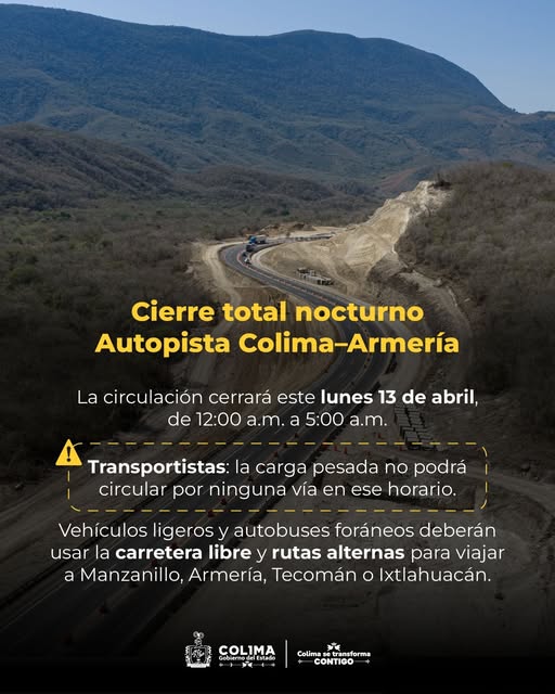Como alternativa, las autoridades recomiendan utilizar la carretera libre y consultar las rutas disponibles en el portal oficial https://rutasalternas.col.gob.mx/. Se exhorta a la población a planificar sus traslados con anticipación y atender las indicaciones del personal para garantizar la seguridad de todas y todos durante la realización de estas.