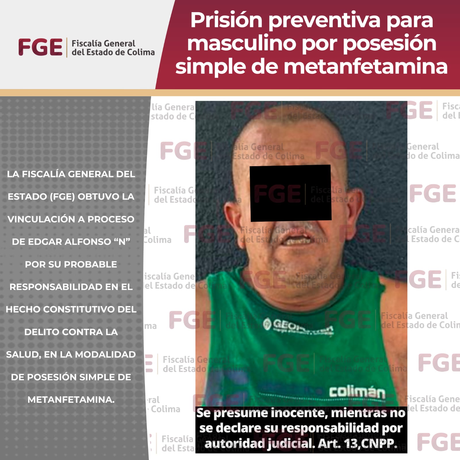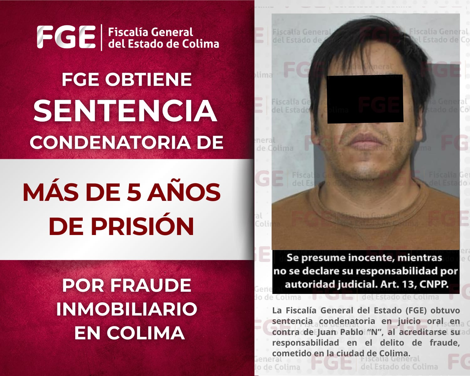 La Fiscalía General del Estado de Colima informa que obtuvo sentencia condenatoria en contra de José Alfredo “N”, penalmente responsable del delito de secuestro agravado, cometido en agravio de una persona menor de edad y de una mujer de identidad reservada, en calidad de víctima indirecta.