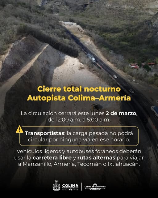 Seidum informa que durante el horario de cierre no habrá circulación para vehículos pesados, por lo que se recomienda programar rutas fuera de este periodo establecido, para evitar contratiempos. En el caso de vehículos ligeros, podrán utilizar la carretera libre como ruta alterna entre los municipios de Colima y Armería, permitiendo la circulación continua durante el tiempo que duren las maniobras.