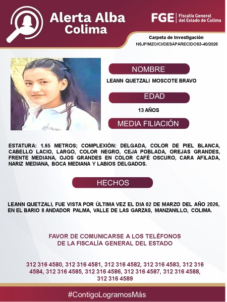 Ha desaparecido otra niña en el municipio de Manzanillo, se trata de Leann Quetzali Mascote Bravo, de 13 años de edad, en las últimas horas.