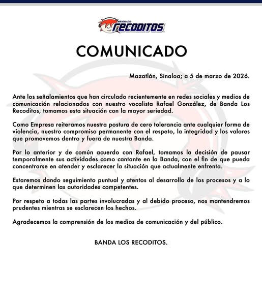 Lamentable lo sucedido, ha sido despedido el cantante de la Banda Los Recoditos, tras ser acusado de violencia intrafamiliar Rafael González, vocalista de esta agrupación musical. ¡Ahora la banda está en busca de un nuevo integrante que pueda llenar su lugar!
