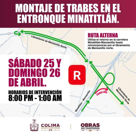 El Gobierno del Estado de Colima, a través de la Secretaría de Infraestructura, Desarrollo Urbano y Movilidad (Seidum), informa que este sábado 25 y domingo 26 de abril de 8:00 de la noche a 01:00 de la mañana se llevarán a cabo trabajos para el montaje de trabes en el Entronque Minatitlán en el municipio de Manzanillo, para dar continuidad a estas Obras Que Transforman la entidad.