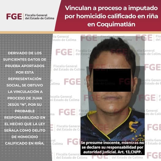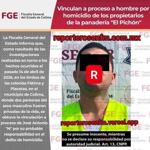 La Fiscalía General del Estado informa que, como resultado de las investigaciones realizadas en torno a los hechos ocurridos el pasado 14 de abril de 2026, en los límites de las colonias Fátima y Placetas, en el municipio de Colima, donde dos personas del sexo masculino fueron privadas de la vida, se obtuvo la vinculación a proceso de José Antonio “N” por su probable responsabilidad en el delito de homicidio.